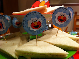 I had this pretty blue card paper which I cut into rounds..I printed a sheet full of Elmo faces, used scalloped scissors to trim and pasted each one on the rounds.