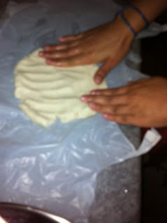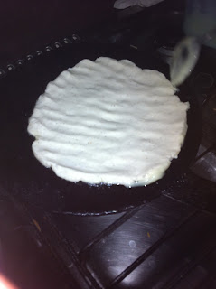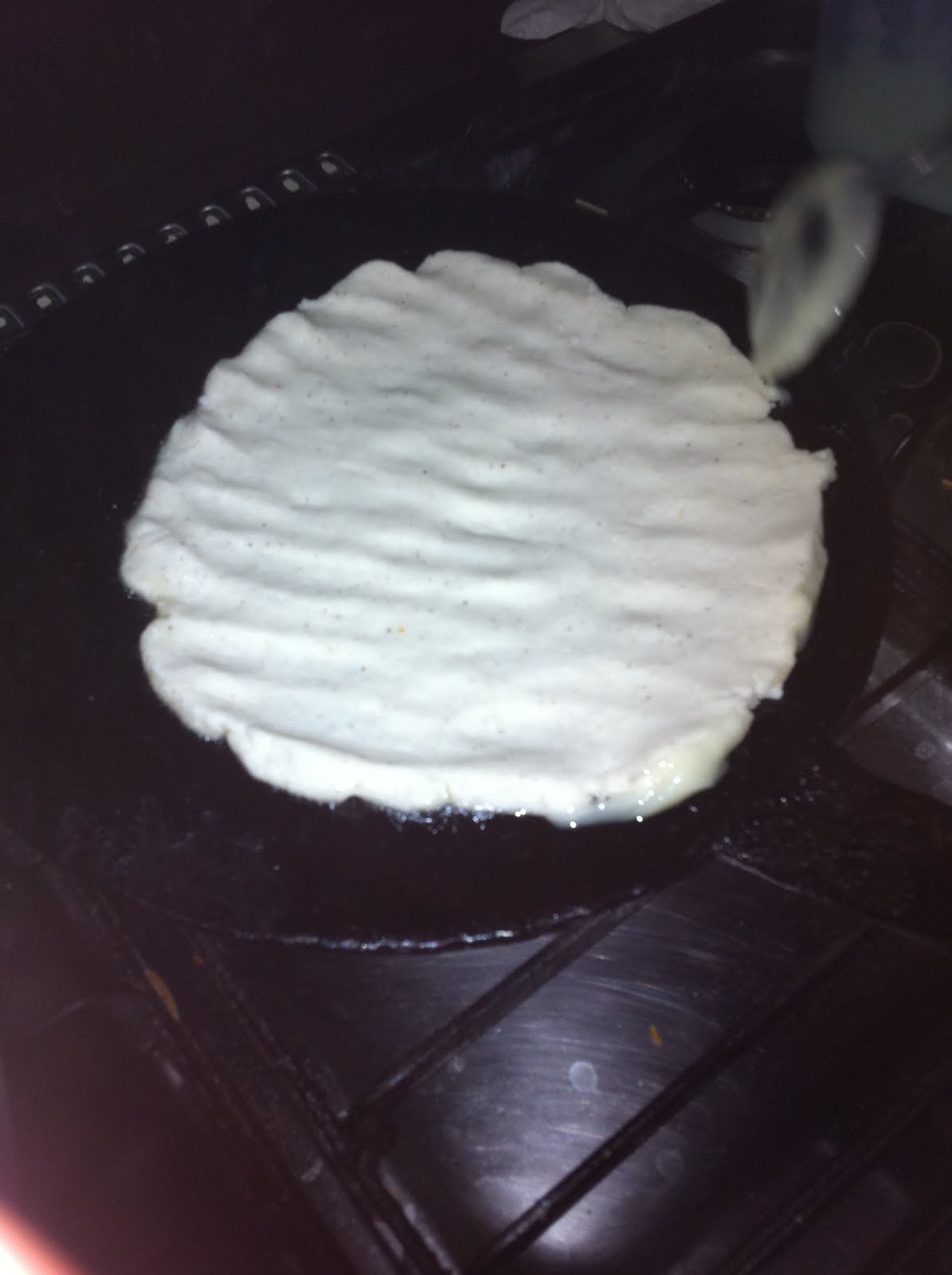 Take a sheet of butter paper or alternatively use a plastic bag as we did.Put you dough on the sheet and press it to shape and spread (about 7-8inches in diameter)
