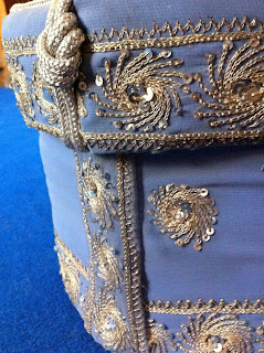 I used my grandmother's Sari, to decorate the box. I know I shouldn't have mercilessly scisssored a beautiful sari but I had to meet a deadline and had nothing else at hand. Made a set of two boxes.