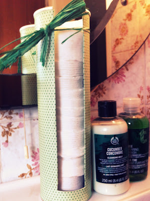 I love nicely decorated vanities with tall glass holders for cotton balls and ear buds..but at the moment I can't have those fancy jars in a small bathroom. So I made something else: