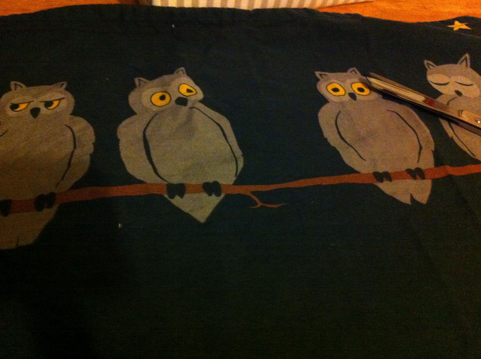 I cut the owl out from this faded pillow case. It was my brother's and I grabbed it when I was staying at my mother's place few months back! I knew I was going to need some wise owls :)