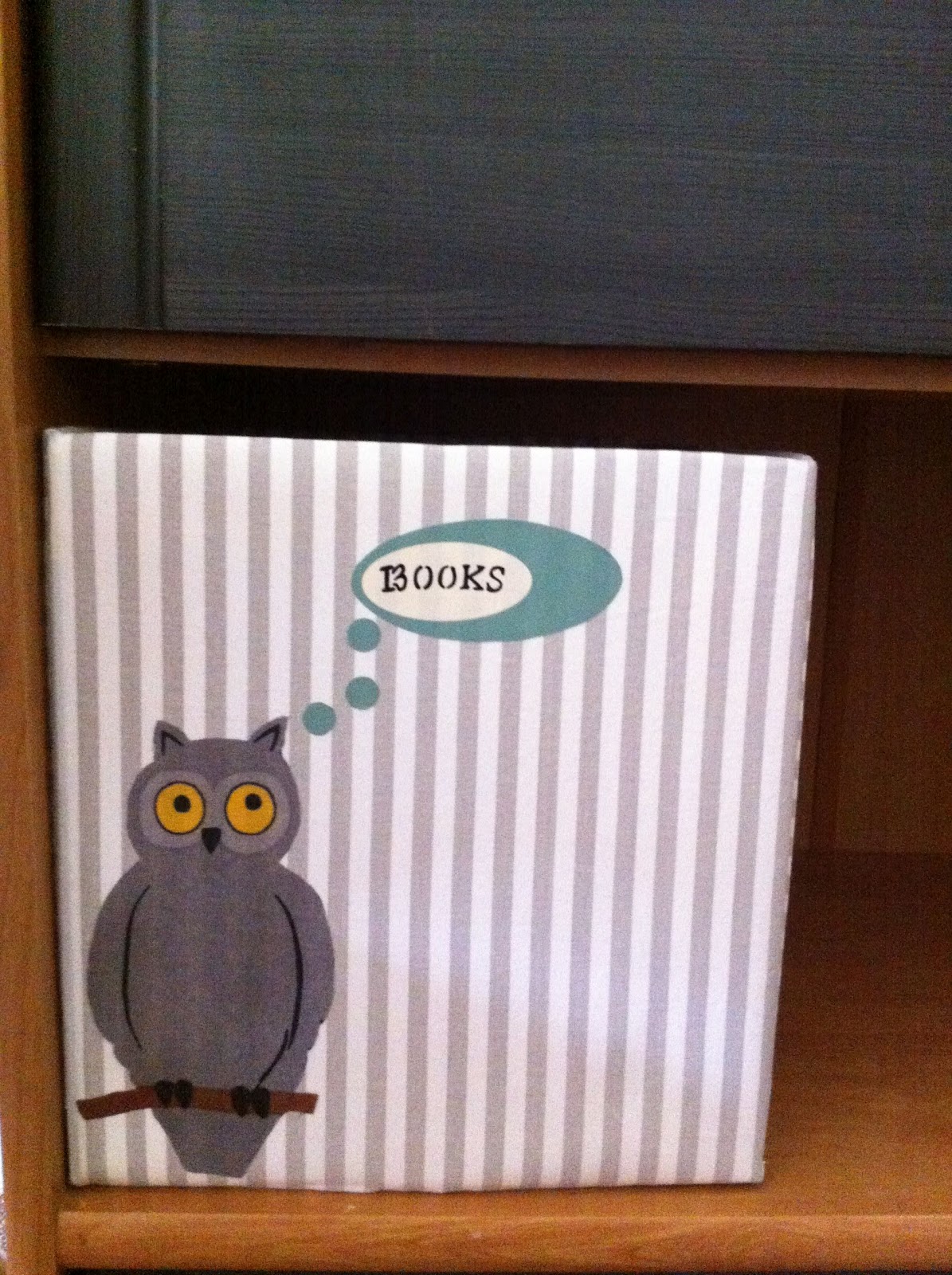 I simply covered the box using a fabric I have used in so many other projects too. I wanted a storage box for my 1 year old's books. After seeing the set of two boxes above..my brain went hmmm > owl > wise > books > pillow > diaper box!