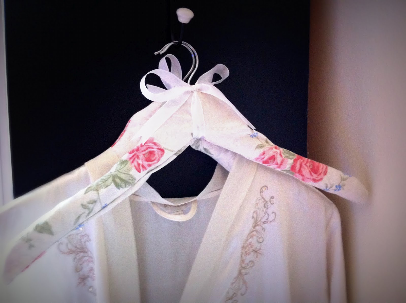 I simply took a couple of wooden hangers and some fabric (repurposed)