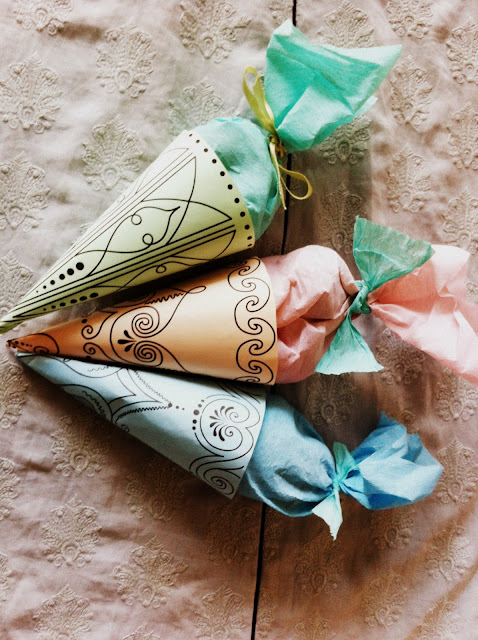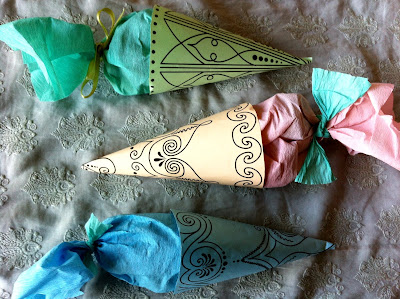 I saw these favor cones on Martha Stewart and wanted to try out..they reminded me of henna cones. So I made some and filled them with sweet treats for some of my friends.