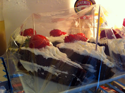 I had some guests coming over for dinner and instead of making a dessert I took the express way and just layered and frosted my chocolate cake wedges. I do the fancy stuff first thing before getting on to the main cooking. To keep it in the fridge I poked some toothpicks in the cake and covered it loosely with cling film. This deters any foreign fingers going into the frosting and keeps it safe in the fridge too:p