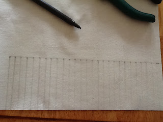 I used white faux leather and some blue yarn. I marked 16x5 cm and straight vertical lines about 2 cm apart. I then cut the lines leaving half an inch from the top. I made a loop of wire and attached my earring loop to it..placed this on the cut piece..Rolled it up dabbing hot glue at intervals.