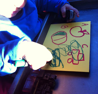 I had these foam stickers which I gave him on the way back. Oh the magic of cars and trucks. He loves them!