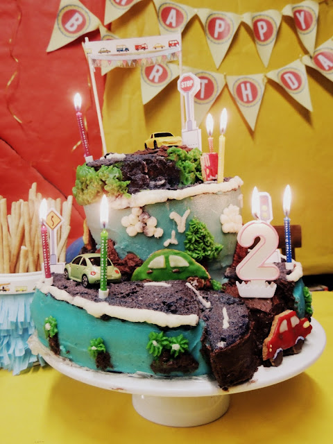 The frosting is all SMBc...I did mess up with the black one..here's my mistake. I was running short on time so I scooped some leftover pudding sitting on the counter into the butter cream to add the dark chocolate base before adding black color..so DO NOT DO THAT. Just in case. The cars are real, except for the biscuits which my friend brought as a gift. I fixed them onto the cake too. Road signs are card paper.
