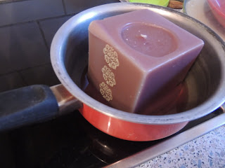 I melted the chunky fellow in an old pot..and poured the wax in a vintage Earl Grey tin.