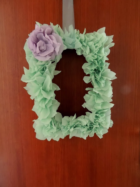 I had some mint green crepe paper on hand and on a quick trip to the basement I found this rectangular styro packing material. I have been desperately wanting to make a door piece ( is that a thing? ) using a wooden frame and a monogram may be...but for the moment I just started off with this rather unplanned Project.