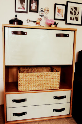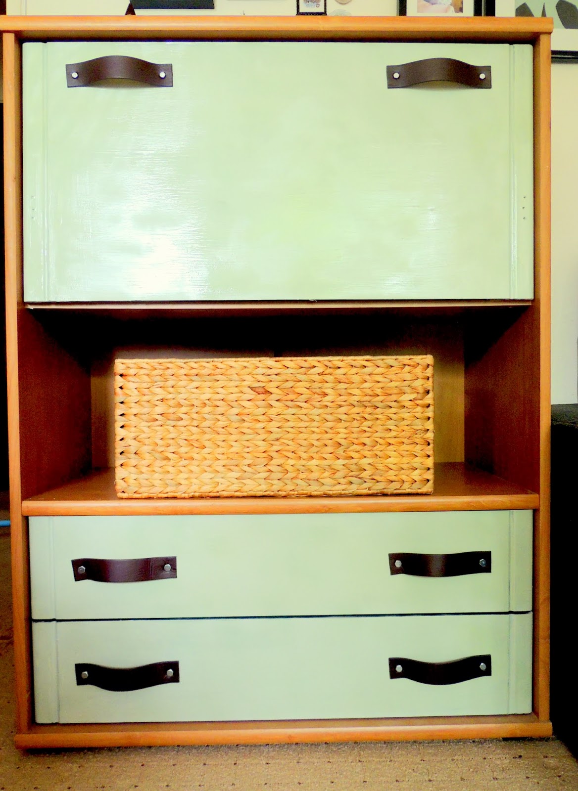 I decided to only paint the drawers and the pull out door so just in case it turned out horribly horrible I could just use the rest of it as an open book shelf.