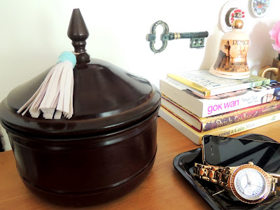 I got this piece sometime back in sale. I picked it up with plans of painting it white but for now I've decided to leave it as it it is..I only added a little tassel to add interest.