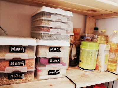 I do not boast of a squeaky clean house, infact sometimes an unexpected door bell sends waves of horror down my spine when I look around to see a dining table heaped with toys..oh the relief to find out that its just the postman! BUT I do like to try making life easier in the kitchen. Before Ramadan started I decided to rearrange my tiny pantry shelf to make it more practical keeping Ramadan in mind.