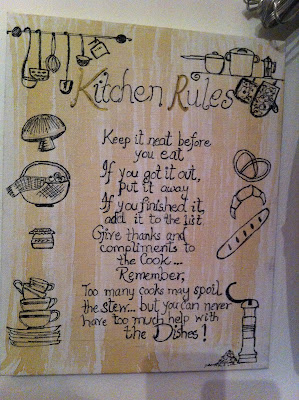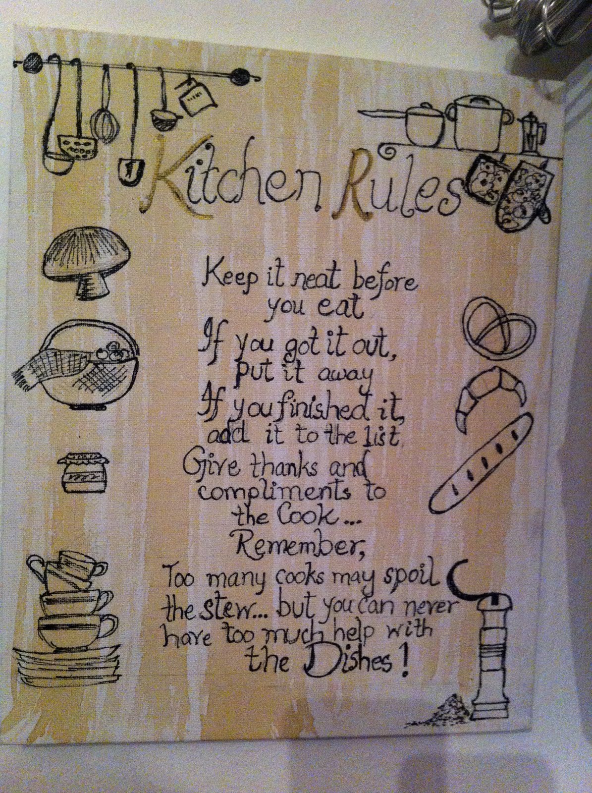 I found these on google and wanted to make one for my kitchen. I doodled away my artsy skills using a black pointer pen on a white canvas. To 'age' it a bit I used a few strokes of black tea stain.