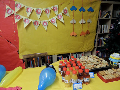 I made six of these cute little buntings for the backdrop.. what you see in the pictures is not the originally set up backdrop. Just before the cake cutting my little fire ball pulled the whole thing down..tearing the sheet of paper I had used to make the background!! I wanted to yell !! But I kept my cool and quickly pulled off a table cover to fix the biggest party blooper ever!! Please notice the three buntings on the right..